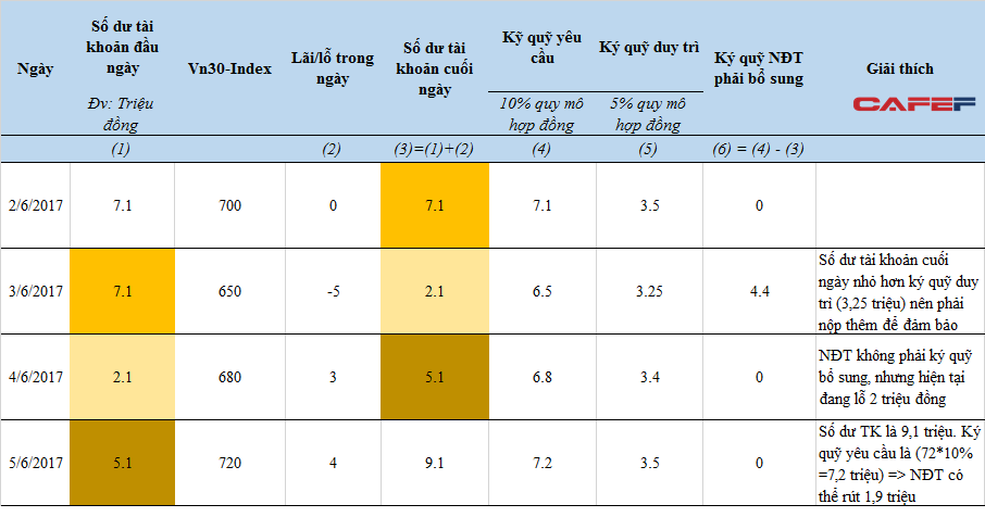 Ví dụ đóng cửa phiên giao dịch ngày 03/06, VN30-Index giảm xuống còn 650 điểm. Nhà đầu tư A lỗ 5 triệu đồng. A phải thanh toán đầy đủ toàn bộ số lỗ phát sinh chậm nhất đến 9h sáng ngày hôm sau.